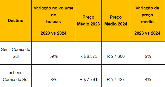 O levantamento foi realizado no dia 01 de fevereiro de 2024, na base de dados do KAYAK, considerando buscas por voos de ida e volta, em classe econômica, de todos os aeroportos do Brasil, para todos os aeroportos da Coreia do Sul. Como datas de buscas foram consideradas de 01/08/2023 a 14/01/2024, comparado com 01/08/2022 a 14/01/2023. Para datas de viagem, foram considerados os períodos entre 15/01/2024 e 31/07/2024 comparado com 15/01/2023 a 31/07/2023. Os preços são uma média e podem variar com o tempo.