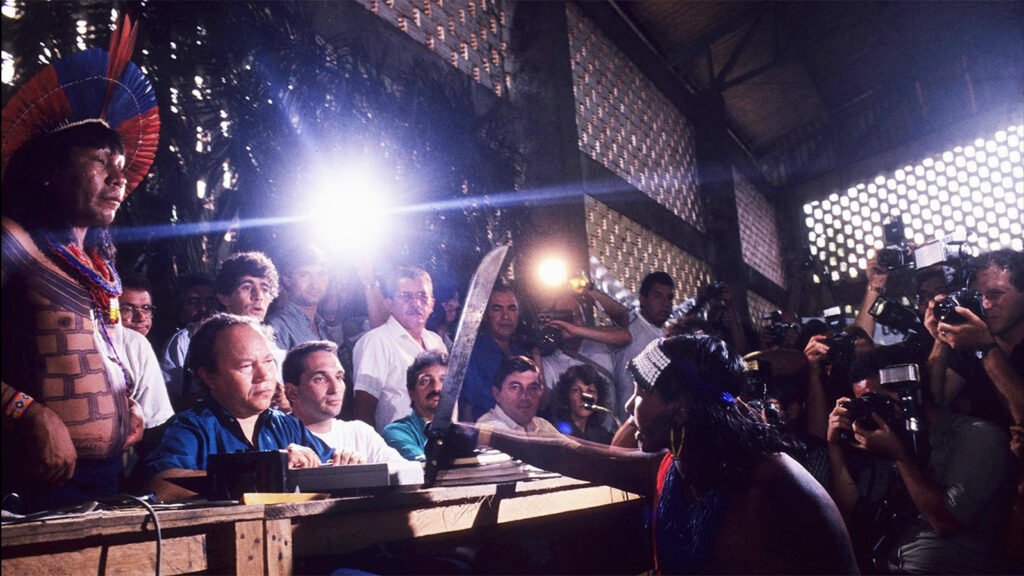 “Ânsia de que a vida seja mais cheia de vida. Árvores e ares, pássaros e parques…” trechos da música ‘Pássaros na Garganta’, de Tetê Espíndola, abrem a temática do quarto núcleo da exposição com enfoque a questões socioambientais. A cantora tem muita conexão com a fauna e flora brasileira; usando até mesmo, gravações de pássaros amazônicos em um dos discos. Aqui são apresentadas realizações de artistas que mostram um Brasil no papel de incapacitador e causador de seus próprios crimes ambientais : invasões de terras indígenas, desmatamento por causa da transamazônica, o assassinato de Chico Mendes, o acidente do césio 137