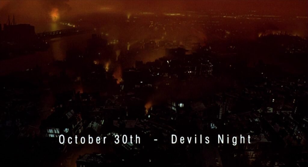 Algo que encanta já no início do filme é sua introdução onde a câmera, sumulado um voo de corvo passando pela caótica cidade em dia noite do demônio nos eventos do filme ocorre um dia antes do Halloween, ambientação gótica com prédios grandes gárgulas faz a cidade está viva além clima caótico faz ser experiência visceral.