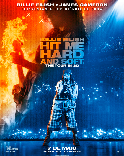 A Paramount Pictures acabou de divulgar o cartaz oficial de Billie Eilish – Hit Me Hard and Soft: The Tour in 3D. O concert movie de uma das maiores artistas pop do mundo registra a sua atual turnê mundial por países da América do Norte, Europa, Oceania e Ásia. A direção é do premiado James Cameron, responsável por obras como Titanic e Avatar, ao lado da própria Billie